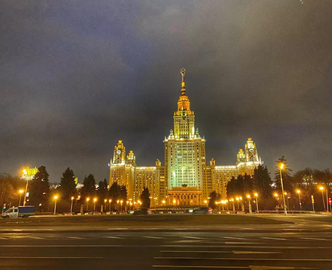 麻雀山頂極目遠眺,望不盡繁華與典雅,巍巍白樺,裊裊浮云,熠熠燈火,在現(xiàn)代與古典中演繹著莫斯科的前世今生,有歷史的厚重感,有蒼生的寫實感,都在闌珊之際拓印出它應(yīng)有的輪廓。莫斯科國立大學(xué)莊嚴肅穆地聳立著,作為莫斯科七座斯大林式建筑之一,其大底座高尖頂?shù)奶厣滞庑涯浚谝鼓缓蜔艄獾妮x映下?lián)纹鹆藲鈩?,展現(xiàn)出最高學(xué)府的極度自信。