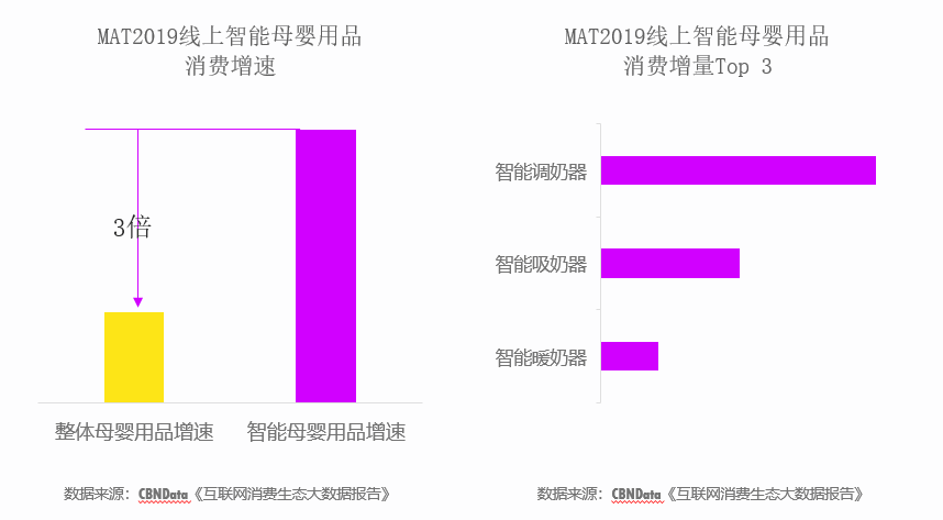 CBNData《報告》顯示,線上智能母嬰用品以高于整體品類平均3倍的增速發(fā)展,其中智能調(diào)奶器、智能吸奶器、智能暖奶器最受歡迎。