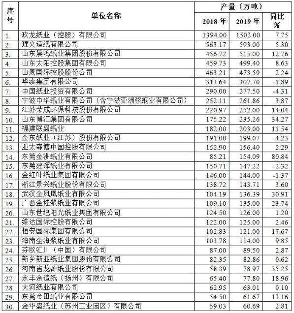 附表:2019年重點(diǎn)造紙企業(yè)產(chǎn)量前30名企業(yè)