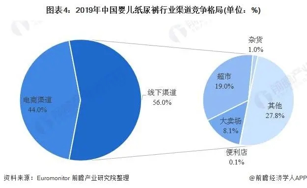 隨著互聯(lián)網(wǎng)以及網(wǎng)購的流行,電商渠道的銷售占比不斷提升,嬰兒紙尿褲電商渠道銷售占比從2010年的4.8%迅速增長至2019年的44%,而以超市、大賣場(chǎng)等為代表的線下渠道銷售額占比從2010年的95.2%減少至2019年的56%。