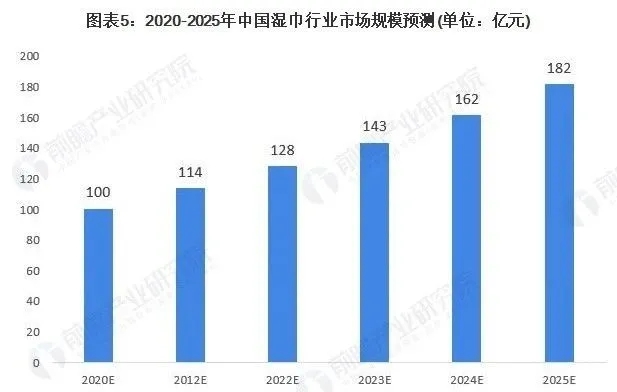 由此可見我國濕巾市場仍有巨大空間,我國經(jīng)濟積極向好,居民消費能力及意愿不斷提升,企業(yè)不斷探索制造多元化的濕巾,且經(jīng)過疫情我國濕巾行業(yè)發(fā)展前景更為明朗,預計2025年市場規(guī)模有望達到182億元。
