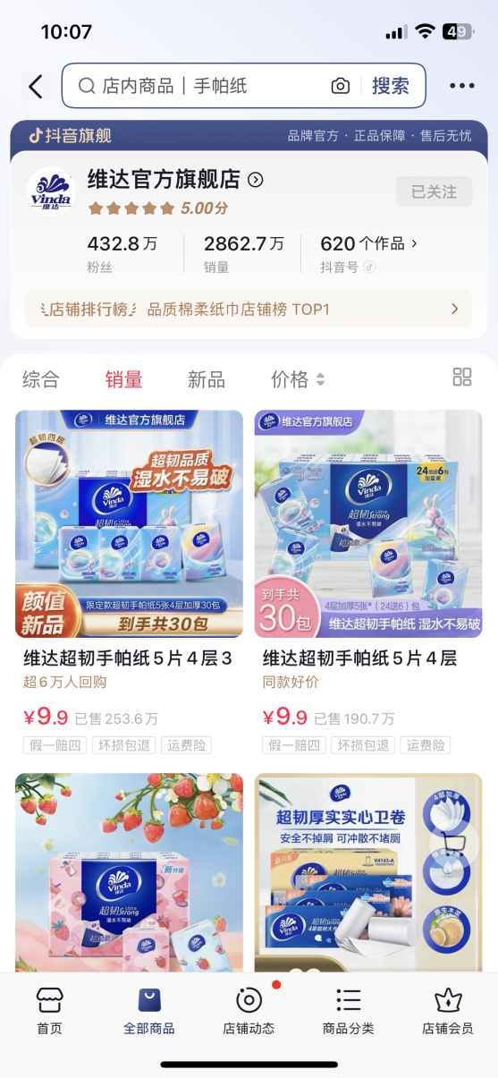 其中以抖音電商為例,維達(dá)在抖音設(shè)立的旗艦店已經(jīng)擁有粉絲432.8萬(wàn),累計(jì)獲贊138.5萬(wàn),并發(fā)布了620個(gè)推廣作品,對(duì)應(yīng)上架商品多達(dá)579件。