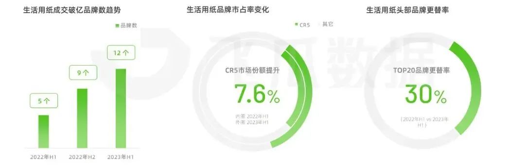 據(jù)飛瓜統(tǒng)計,2023上半年抖音平臺成交破億的生活用紙品牌數(shù)已超過12個,較22年同期增加7個。其中,CR5品牌市場份額為34%,較22年同期增長7.6%,頭部品牌集中度進一步提高。