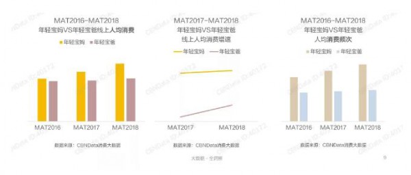 在更為開放、富足的環(huán)境下成長起來的80、90后年輕一代,大多受過良好的教育,生活水平也有所提高,他們在育兒觀念上更加開放,在包括紙尿褲在內(nèi)的眾多母嬰用品上,年輕寶爸寶媽更舍得花錢,他們有強(qiáng)烈的消費(fèi)意愿,還具備足夠的支付能力,成為母嬰消費(fèi)市場的中堅力量。數(shù)據(jù)顯示,近年來,年輕寶媽寶爸的線上人均消費(fèi)逐年提升。相比寶爸,寶媽的增速更快,達(dá)到兩位數(shù)的高速增長,消費(fèi)潛力巨大。從消費(fèi)頻次來看,年輕寶媽更愛剁手,他們的消費(fèi)頻次遠(yuǎn)高于寶爸。
